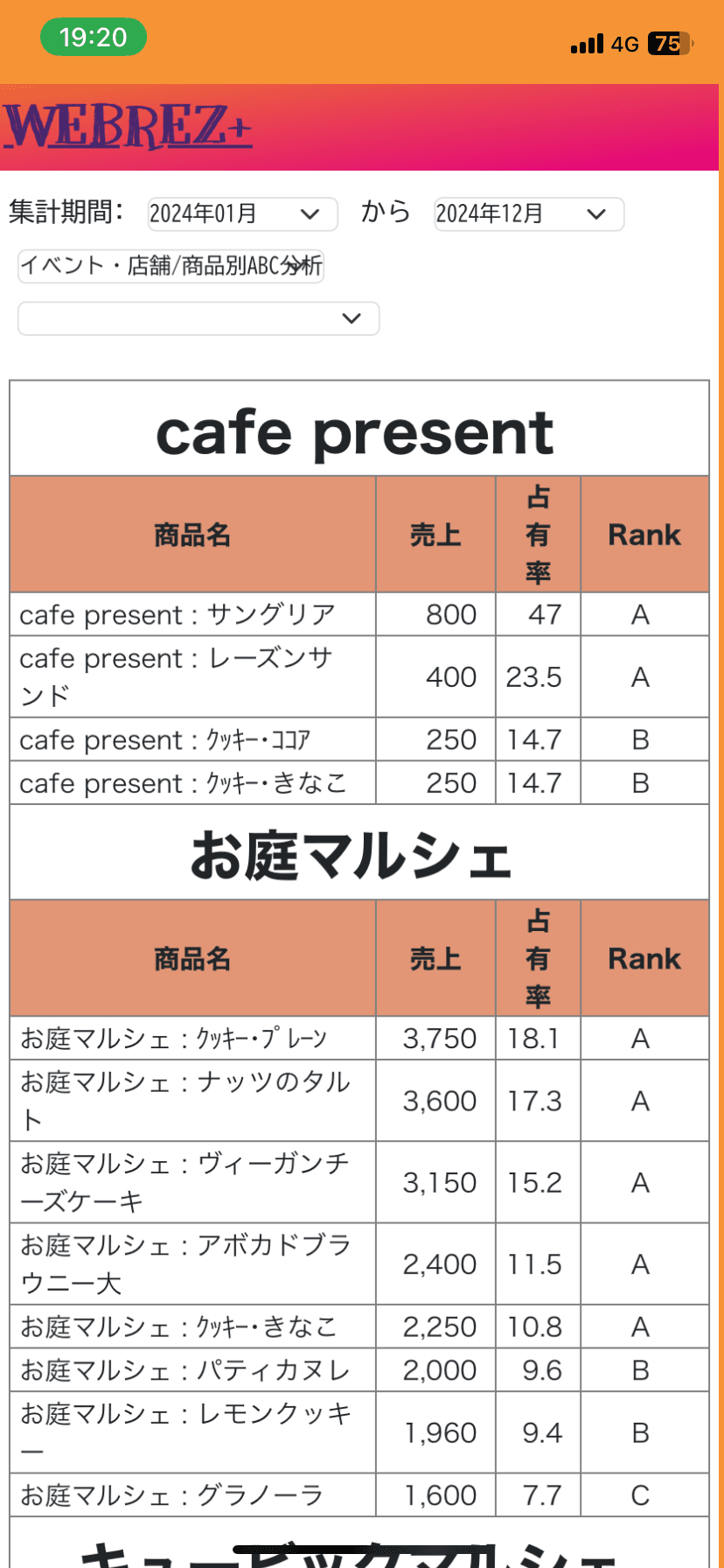 商品の売上ランキングやABC分析。イベントごとの平均客単価や平均売上。